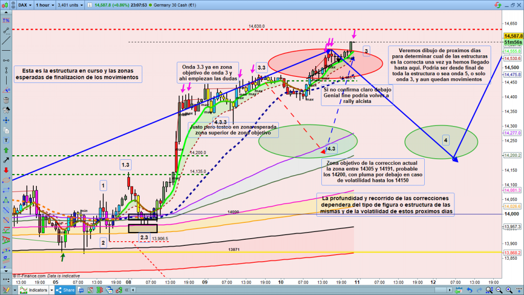 Lo ocurrido es lo explicado anteriormente, no perdió la Genial line de H1, en 14400. Desde pre apertura y confirmado en apertura, rally alcista validando nuevo alto por encima de 14455, buscando la zona objetivo, en zona de influencia de 14550. A partir de las 22 h, nuevo impulso después de cierre de mercados Usa, con un nuevo máximo que abre aún más si cabe, los conteos posibles de esta estructura final.