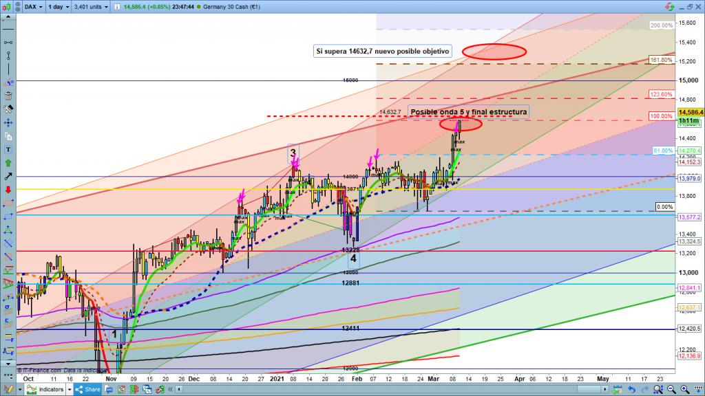 En gráfico semanal del dax30, desde el último gran mínimo en la zona de los 7970, planteo todas las diferentes estructuras posibles, aun ahora y con el precio en la zona ya de los 14600, después de estudiarlo todo, el conteo más probable sigue siendo el que hace meses que venimos siguiendo. Nos traía con muchas probabilidades a la zona 14500 a 14550 con posible pluma hasta 14600, y no debería de pasar, de la cota 14632,7. De momento es la estructura más probable. Pase lo que pase a partir de este punto, nos ha traído hasta la zona esperada, siguiendo la tendencia. Si ahora hiciera un alto por encima de 14632,7, desecharíamos el conteo que considerábamos más probable y validaríamos el siguiente conteo, con lo que podríamos marcar nuevos objetivos, siempre en favor de tendencia nunca Contra tendencia. Si superara la zona del 14632, siguiente objetivo la directriz superior del canal de Elliot, cuidado que tendríamos nuevo canal, dado el nuevo conteo tendríamos una nueva onda 2, lo que haría un dibujo diferente del actual. No creo que sea hoy el día para entrar en el detalle de los conteos, vamos a esperar el dibujo, y luego con más claridad podremos entender el porqué de cada estructura.