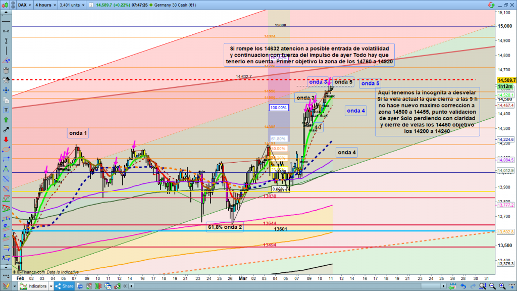 La verdad pensaba que lo más probable para el día de ayer era una corrección de nuevo hasta la zona comprendida entre 14305 y 14191. Sin embargo, ha continuado la tendencia alcista, mínima corrección, en sesión asiática, hasta 14400, zona muy importante y frontera con la Genial line de H1 entre rally alcista y rally bajista. Ya desde pre apertura y confirmado en apertura del parquet de Frankfurt, rally alcista. En el análisis de ayer había marcado la zona 14450, como confirmación de rally alcista, con objetivo la zona 14500 a 14550, y así fue. Solo que después de llegar a la zona de influencia del 14550, la cotización dax no freno, se mantuvo en zona de onda 3, menor que onda 1, en esta última estructura, pero justo a las 22 h con el cierre de los mercados americanos, nuevo impulso, marcando ya zonas muy altas y cercanas a la zona límite según conteo de gráficos mensual y semanal, conteos seguidos desde hace meses, que independientemente de lo que ocurra ahora, de momento nos han llevado hasta la zona segura donde debíamos de llegar los 14450 a 14500.