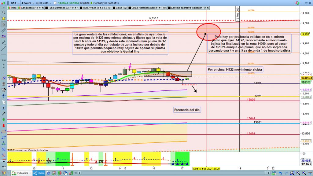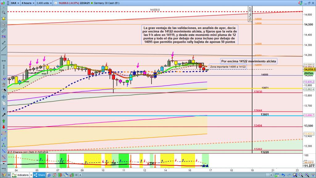 Si ayer me consideraba inocente, hoy con cara de tonto, lo único cierto para mí es que esta semana ha de ser importante, ya que si no finaliza impulso entre hoy miércoles y el viernes, lo más normal seria que no finalizara con testeo a directriz de canal de Elliot, y estando tan cerca desde hace tantas semanas, se me hace difícil, pensar en un patrón de final de movimiento sin posible testeo a la directriz que la semana que viene ya estaría fuera de rango. Pasar no pasa nada, pero los mercados aunque para un neófito puedan parecer caóticos, la verdad, es que es increíble, como cumplen las normas y las estructuras, y muchas veces al milímetro, al punto, después de recorrer cientos o miles de puntos. Técnicamente ayer daba como más importante para el estudio del día, el gráfico de 4 horas, y en él decía lo siguiente: Podéis ver el análisis clicando este link Análisis Diario Dax 16 febrero 2021