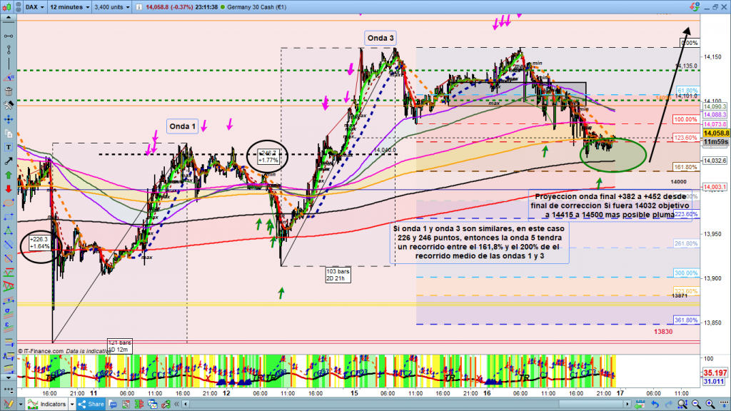 Análisis diario Dax, estudio técnico. El PA en la cotización Dax está en 14059, Estudios con ondas de Elliot para entender qué es trading con el Dax30.