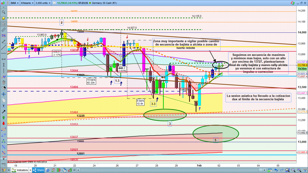 En gráfico de 4 horas del dax30, vemos como durante sesión asiática, la cotización dax, reboto en la cota histórica 13644, y volvió a atacar la zona alta 13680 a 13700, sin llegar a invalidar de momento, estamos todavia en horario de final de asiática y antes de pre apertura, la secuencia bajista de H4 que comentábamos ya en el día de ayer. Durante el día la zona de invalidación bajo de 13746 a 13727, muy cerca de donde está testeando el precio desde hace horas, sin acabar de momento de realizar un cambio de tendencia operable. Cuando esto ocurre, normalmente suele comportar primero volatilidad, y después entrada de fuerza en el mercado al enseñar camino, tanto si tenemos invalidación de secuencia anterior y por tanto validación de nuevo movimiento, como si en la zona se produce un importante rebote, Por precaución, sería operativa a largos por encima de 13727, o operativa a cortos, por debajo de la cota histórica importante del 13601, con perdida de la misma y confirmación de quiebre, aunque sea en gráfico más pequeño.