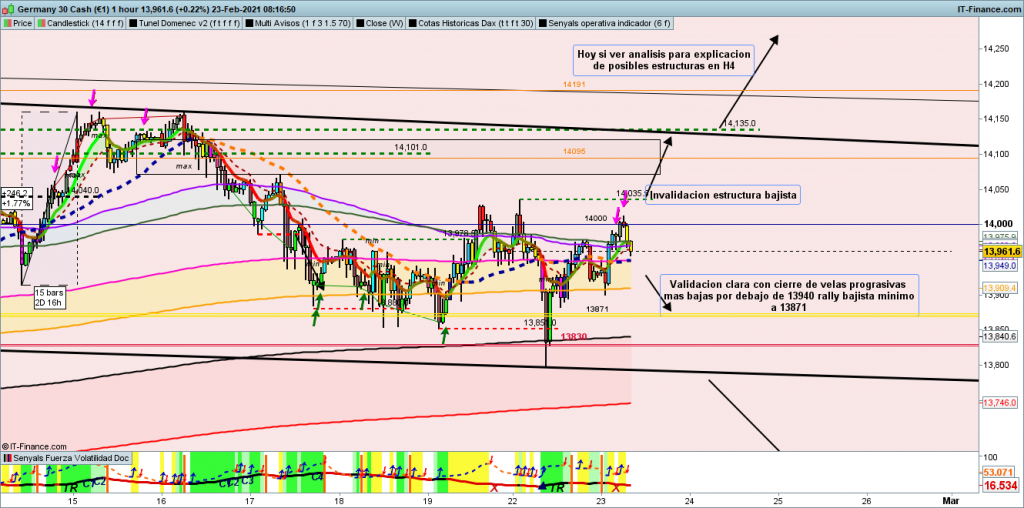 Fuerza y recorridos desde la apertura de Frankfurt, volviendo a secuencia bajista después de 3 movimientos, de corrección. Después desde apoyo en 13830, cota histórica, importante recorrido en dirección contraria, llegando en asiática hasta la zona de los 14000, de nuevo. El mercado esta difícil nada noble, seguimos en zona de indecisión e indefinicion de una estructura clara. Lo normal seria que el movimiento en curso ahora a estas horas de casi final de asiática, fuera solo una corrección, para volver con más fuerza a la senda bajista, en busca de la zona 13644 a 13601, como mínimo. La invalidación de esta opción sería. un alto por encima de 14035, teórico techo de la anterior corrección. Ayer planteaba esta situación y posibles entradas de trades. Sin embargo desde validación hasta zona de Stop Loss, había mucha distancia, con lo que las estrategias de entrada, ya anticipaban una entrada difícil y de demasiado riesgo, con lo que era de una de aquellas situaciones de mercado complejas de operar.