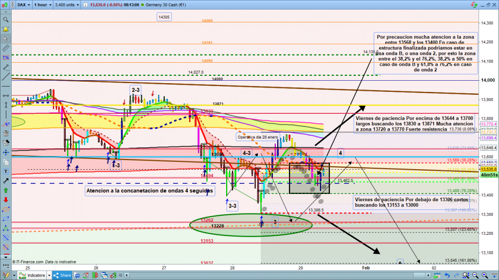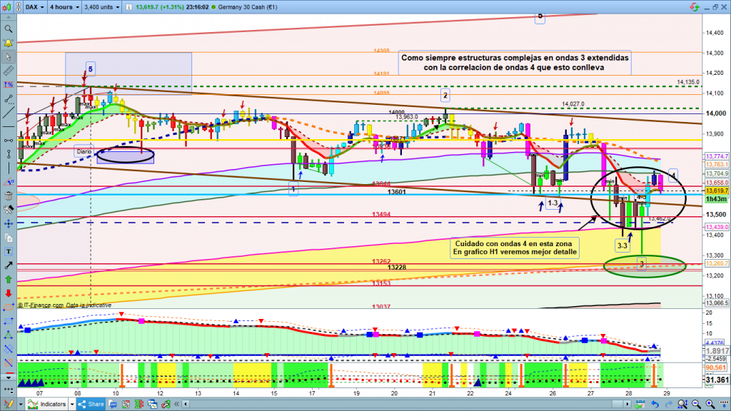 Vemos como desde los 13400, en que finalizo anteayer por la noche la posible onda 3-3, la cotización dax, hizo exactamente el camino trazado, corrección hasta la zona de los 13601, cota histórica importante, ahí empieza rally bajista de nuevo impulso, en sesión asiática, y que se acelera en pre sesión europea, consiguiendo gran recorrido con la vela de apertura, y testeo a la zona objetivo marcada, justo por la parte superior en la zona de los 13300. Desde este momento rally alcista para teórica corrección de onda 4, que llega hasta la zona esperada en 13601 a 13644, y se pasa un poco de frenada con unos 60 a 70 puntos más, que al ser más alta de la corrección anterior, genera algunas dudas. En principio lo más lógico es que falte el último impulso bajista hasta la zona de los 13153, a 13000. Sin embargo el dibujo dejado debe hacer que seamos un poco más prudentes, y estemos pendientes de las dos posibles zonas que son continuas y que abarcan una zona entre los 13565, y los 13400, la primera parte entre los 13565, y los 13500, podría ser la zona entre el 38,2% y el 50%, de una posible onda b, de onda 2, de estructura bajista, y la zona entre los 13500, y los 13400, posible zona de corrección de onda 2 con objetivo entre el 61,8% y el 76,2%. Por tanto, mucha atención a esta zona marcada, porque hay una concatenación de ondas 4, que como siempre hace difícil los conteos de final de recorrido. Para entender todo lo explicado, como siempre más vale una imagen que mil palabras.