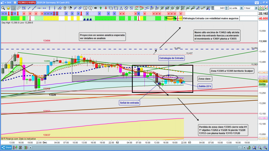 Y en el análisis explicando con detalle los posibles movimientos decía: «Zona clave entre los 13320 y los 13305, en caso de rebote en la zona, volveríamos a la zona del 13395 a 13415, con cierres de velas dos consecutivas con nuevos máximos encima de esta zona, tendríamos nuevo ataque a la zona del 13462. Su posible quiebre y confirmación, nos llevaría ya con fuerza a 13494, 13601, con posible pluma por proyección hasta 13655 a 13666. Si en cambio pierde la zona del 13305, (no con pluma, sino con cierre de velas), objetivo más inmediato 13262 y 13228, la perdida de 13228, objetivo cota histórica 13153, con posible pluma hasta los 13100 a 13070.» después en H1 decía con más detalles y más ajustados «En el gráfico de 1 hora del dax30, nueva ratificación con más detalle y ajustes del escenario previsto para el día de hoy, la posible proyección de la pluma en el caso de que la cotización dax bajara hasta los 13153, y que en H4 marcábamos zona de 13100 a 13170, ajustando en H1 la situaríamos en 13115 a 13120, por prudencia esta debería ser la zona de salida del trade» y lo ocurrido durante el día ha sido: