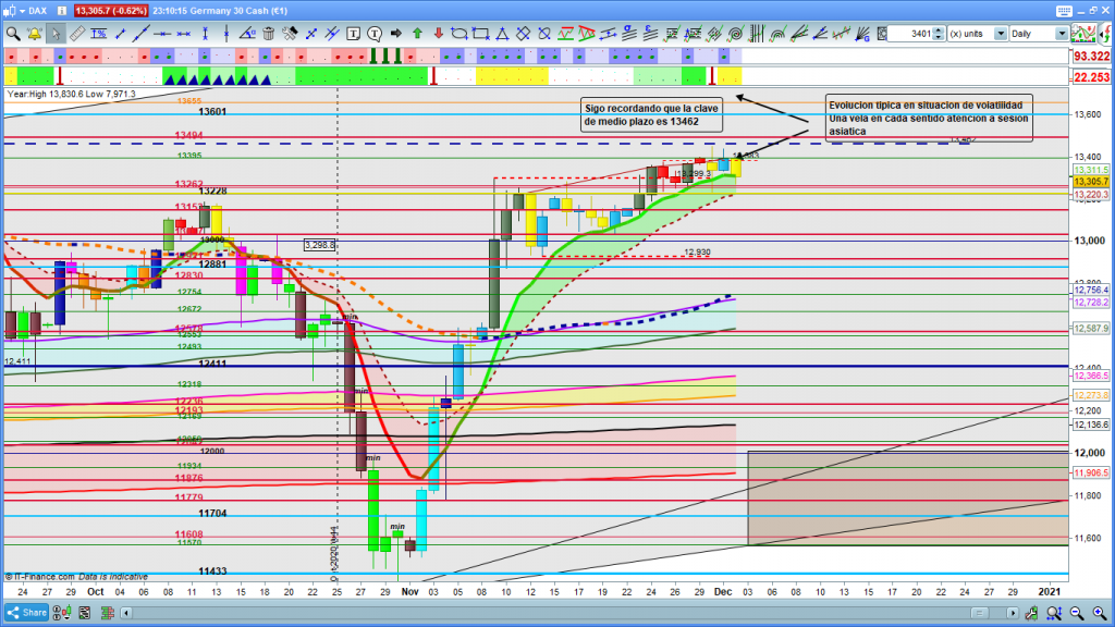 En el gráfico de 1 hora del dax30, mismo escenario que ayer, con validación de perdida de zona clave, que por cierto se mantiene en la misma zona, y en caso de cierre de dos velas de H1 por encima con nuevos máximos nos serviría de invalidación de movimiento bajista esperado, y validación de probable nuevo rally alcista, sobre todo comprobar si hay fuerza en el mercado o no, esto se ve con claridad con el color de las velas del indicador Control Total Doc, velas verde oscuro y rojas, fuerza alcista, velas marrón oscuro y verde, fuerza bajista. Si sigue el movimiento más probable y sigue hacia abajo soportes en 13262, 13228, ambas cotas históricas, la segunda coincide con apertura anual 2020, y ha sido especialmente importante este último mes con la poca fuerza del mercado. Solo en el caso que comentaba de cierres de velas más altas progresivas por encima de zona clave, y sobre todo con un alto por encima de 13395, nuevo ataque a la zona del 13462. Lo importante tanto en una dirección u otra es que entre fuerza, ya que sin ella los posibles recorridos son erráticos y los objetivos que están relativamente cerca tardan días en cumplirse, si os fijáis estamos en el mismo escenario que ayer con validación bajista pero casi en la misma zona. Muchísima suerte y muy buenos trades.
