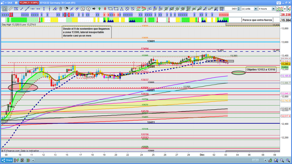 En gráfico de 4 horas del dax30, a reseñar lo que parece por fin entrada de fuerza, si miráis el gráfico parece la más importante desde hace un mes. Desde el pasado 9 de noviembre que la cotización dax, llego hasta 13299, llevamos un mes con un lateral prácticamente inoperable. Técnicamente, la cotización dax esta en zona bajista, debajo de la zona de corrección e incluso de la Genial line. El objetivo más probable en estos momentos es la cota histórica del 13153, con pluma hasta 13120 a 13110. La invalidación de esta estructura la tendríamos con cierres de velas (mínimo dos progresivas) en altos por encima de 13333. Si se diera esta última circunstancia, objetivo nuevo ataque a 13462 y extensión del movimiento por arriba, aunque la posible del recorrido bajista, es mucho más probable a estas horas anteriores a la pre apertura.
