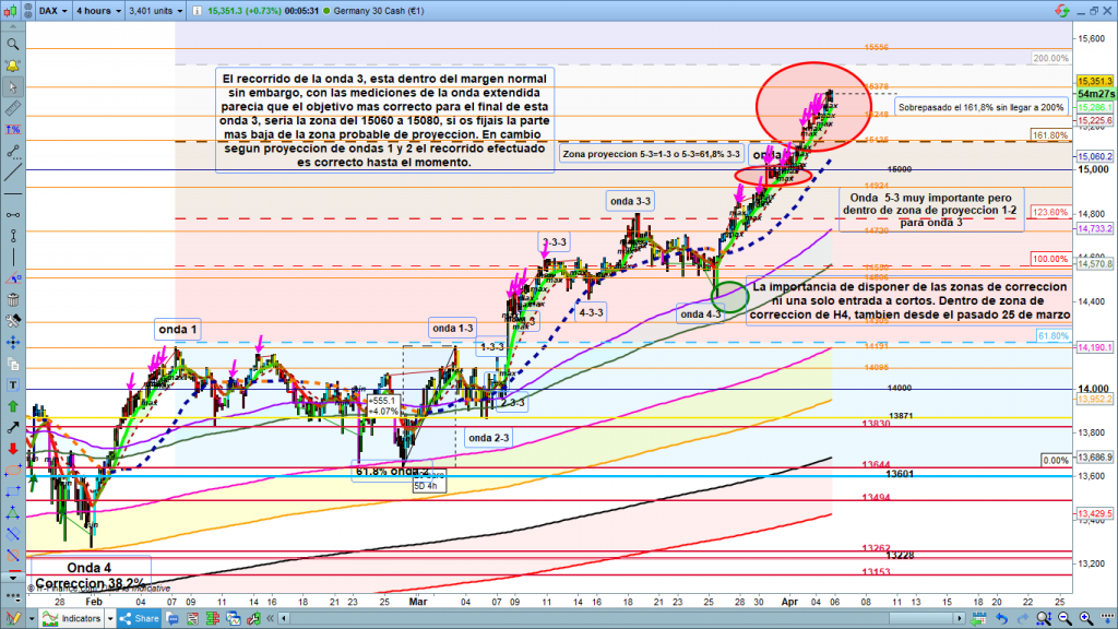 Sin embargo, como he comentado dadas las especiales circunstancias provocadas por el cierre de Pascua, lo más prudente es estar fuera del mercado en el inicio de la sesión europea de hoy, tanto a las 8 h en pre apertura, como sobre todo a las 9 h en la apertura del parquet de Frankfurt. Aún podría ser un falso quiebre y volver no solo por encima de la Genial line, sino, y sería lo importante, volver de nuevo por encima de la zona de corrección de H1, consolidando la zona y marcando nuevos máximos antes de corregir. En el caso de validación de quiebre con el cierre de la vela horaria de las 9 h, se confirmaría la corrección. En este caso la zona más probable a alcanzar es la cinta azul de H1, entre los 15110 y los 15000. Atención en el caso de volatilidad a la zona del 50% en la cota 14895, y ya después de posible dibujo de estructura, podríamos ver si la corrección es con figura lateral, simple o compleja como la última, o los nervios de toma de beneficios nos forman un abc. Paciencia y prudencia, sobre todo a primeras horas de la sesión europea, a partir de pre apertura a las 8 h. Muchísima suerte y muy buenos trades espero que todos/as estéis bien después de estos días de vacaciones de semana santa.