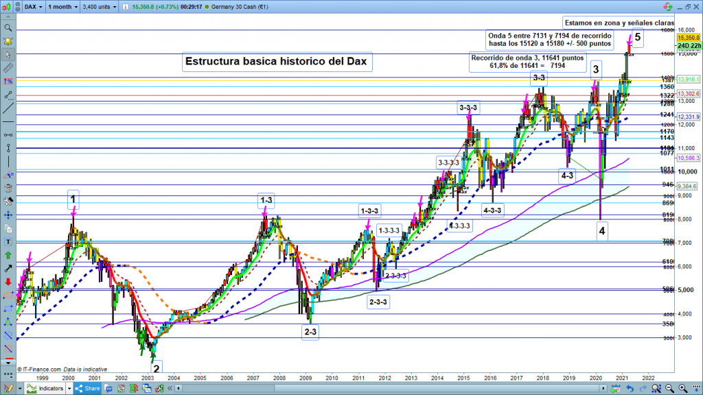 En gráfico de 4 horas del dax30, toda la estructura de la onda actual, onda 5-5-5- y final de estructura. El objetivo más probable de final de onda 3, era 15060 a 15080, según las mediciones de las sub ondas de la onda 3 extendida, y que además entraba en la parte inferior de la proyección más importante, hecha con las ondas 1 y 2 iniciales de la estructura. Estructura con onda 1, que empezó a finales de enero del 2021, onda 2, desde el 8, al 26 de febrero, y onda 3, ya en su parte final pero todavía en curso. El 161,8% de proyección de esta onda 3, en referencia a ondas 1 y 2, está en 15135, coincidente con cota proyectada, sin embargo los cálculos efectuados con las diferentes sub ondas, que componen la onda 3 extendida, nos daba la zona de 15060 a 15080, como la más probable para finalizar la estructura de onda 3, apenas a 50 puntos de la proyección general del 161,8% pero zona muy probable de final de movimiento. Sin embargo ha ido subiendo de forma incansable en estos días de cierre de parquet. Veremos lo que ocurre a las 9 h, de la mañana. El hecho de que un movimiento sobrepase la zona del 161,8% es muy normal, es más lo habitual es que sobrepase la zona de proyección técnica, y acabe en la zona de resistencia más próxima, al estar en máximos históricos, no tenemos referencia de zona de posible resistencia importante, con lo que veremos lo que ocurre hoy en la apertura de Frankfurt.