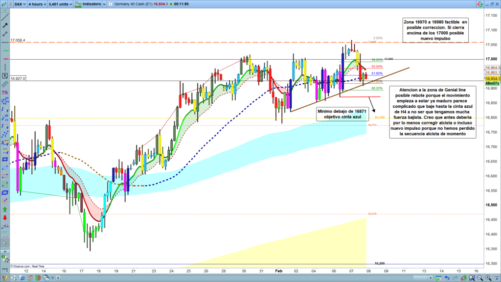 Técnicamente, un mínimo por debajo de la zona de los,16871, nos proyectaría de forma clara a la zona objetivo entre los,16830 a 16785. Por el lado contrario, si tenemos quiebre y confirmación de quiebre por encima de la zona de corrección de H1, entonces la zona objetivo inmediata sería la zona de la genial line de H1 y la cota psicológica de primer grado de los, 17000. Convirtiéndose precisamente esta zona entre los 16992 y los 17000, como zona clave muy importante para la posterior evolución del precio.