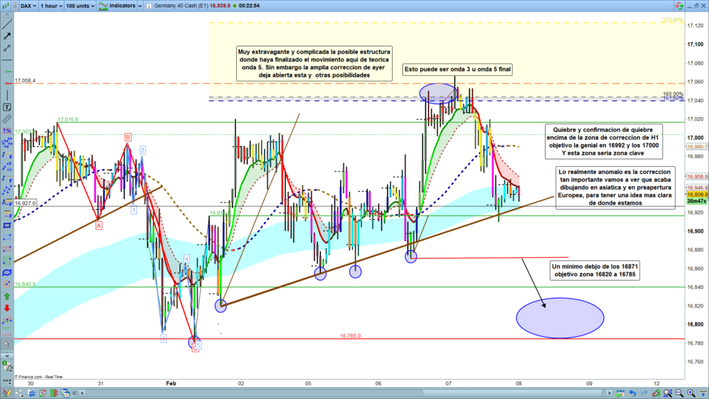 En el caso de quiebre claro y confirmación de quiebre por encima de esta zona comentada los, 16992 a 17000, el movimiento más probable sería un último impulso hasta la zona ya anteriormente proyectada entre los, 17080, y los 17120. Si, en cambio, el precio llegando hasta esta zona rebotara de nuevo hacia abajo y con fuerza, a la que nos volviéramos a situar por debajo de la zona de corrección de H1, la zona objetivo más probable sería la zona de los, 16830, a 16785.