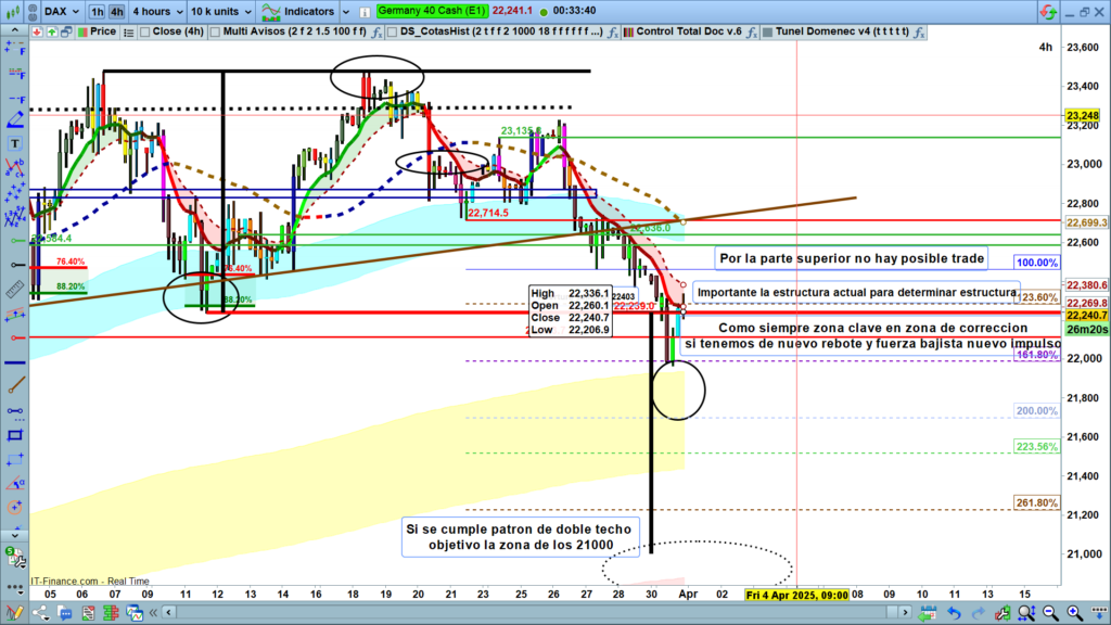 El DAX se encuentra en una fase crítica de decisión, con señales tanto alcistas como bajistas. La confirmación de un patrón de doble techo o un repunte sólido desde los 22,000 puntos será clave para definir la dirección futura. Los traders deben estar atentos a los niveles de soporte y resistencia mencionados, así como a cualquier desarrollo macroeconómico que pueda influir en el mercado.