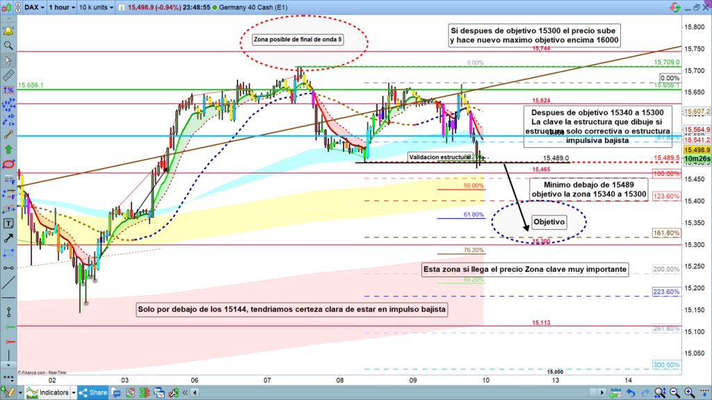 La otra posibilidad es que después de completar el movimiento esperado hasta la zona entre los 15398 a 15340, y los 15300, el movimiento de volatilidad alcista fuera tan importante como para marcar un nuevo máximo, justo por encima de los 15709. Si este fuera el caso, ya mediríamos exactamente lo ocurrido, y las zonas alcanzadas y estructuras dibujadas, para proyectar, pero de entrada, parece que la proyección de este nuevo impulso alcista, podría llegar hasta la zona de los 15980 a 16000, como movimiento impulsivo.