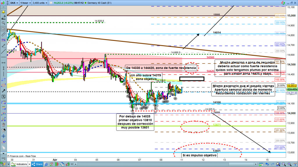 En gráfico de 1 hora del dax40, mismo escenario que el pasado viernes, y mismo planteamiento que el del gráfico de 4 horas del análisis general. Solo que aquí tenemos más zoom.