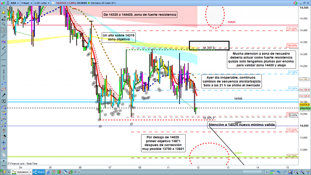 Personalmente, lo más lógico, para mí, es esta última opción. Si hace un mínimo por debajo de los 14025, debería entrar algo de fuerza e ir acelerando el movimiento bajista, a los objetivos marcados 13871, y 13700 a 13601. Solo si se quedara entre la zona alcanzada y los 14100, podríamos tener otro día inoperable lateralizando esta zona en torno a los 14100. Muchísima suerte y muy buenos trades.