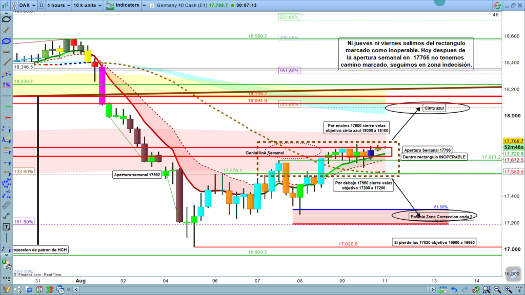 Parte inferior, solo después de que el precio volviera a quebrar y confirmar zona de corrección y genial line de gráfico de 4 horas, parece muy complicado que lo pudiera hacer en principio el día de hoy lunes, pero si lo hiciera, solo con cierre de vela por debajo de los, 17550, tendríamos un movimiento de muy alta probabilidad, tanto si estuviéramos en corrección como si estuviéramos en impulso bajista, hasta la zona de los,17300 a 17200.