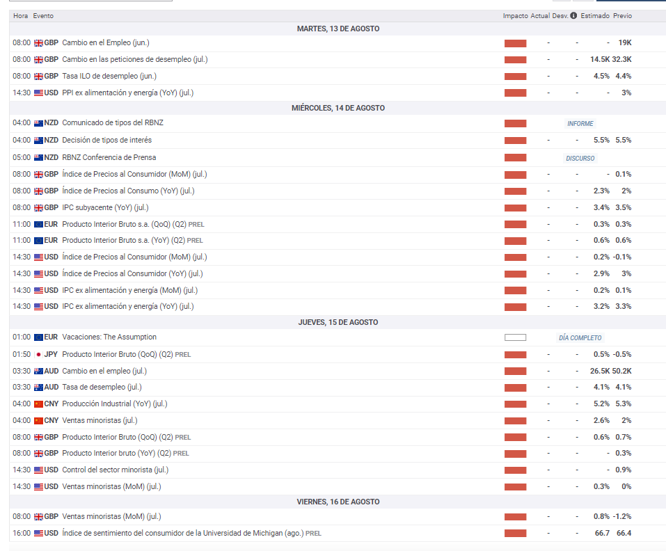 Publicado lunes 12 de agosto de 2024, a las 00 h UTC. Las horas del Calendario Económico, son UTC+2.