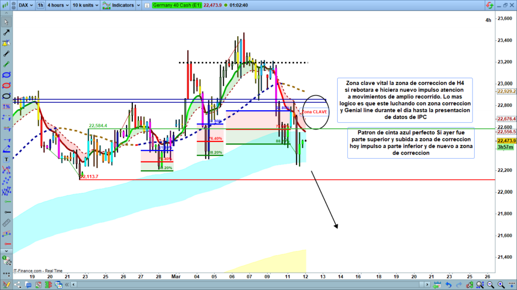 El DAX sigue moviéndose dentro de la estructura de cinta azul que venimos proyectando los últimos días, y tras el fuerte rebote desde el soporte clave en 22.500 puntos (zona 88% de Fibonacci), hoy martes ha atacado momentáneamente la zona de corrección de H4, aunque de forma poco clara, volviendo a entrar en rango.
