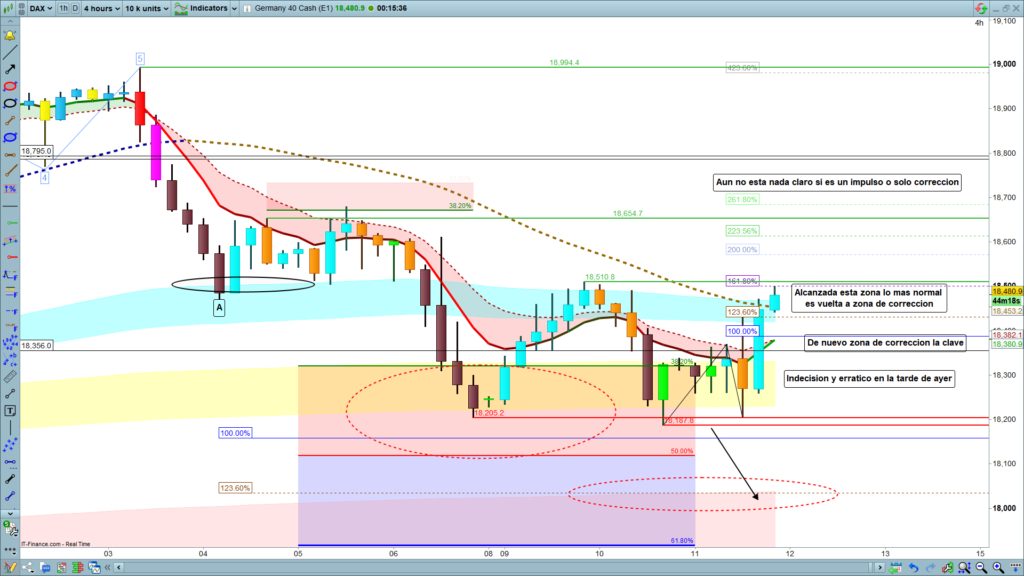 Lo malo, es que la proyección del movimiento interior realizado, ha llegado ya hasta la proyección del 161,8%, con lo que independientemente de alguna pequeña pluma que pudiera hacer ahora justo en el inicio de sesión asiática, lo más probable es que vaya bajando de nuevo hasta la zona de corrección de gráfico de H4, en la zona de los, 18400. Por tanto, un día más la zona de corrección, si se cumplen los movimientos que acabo de explicar, la zona de corrección de gráfico de cuatro horas volverá a ser la zona clave para la evolución del precio de la jornada de hoy.