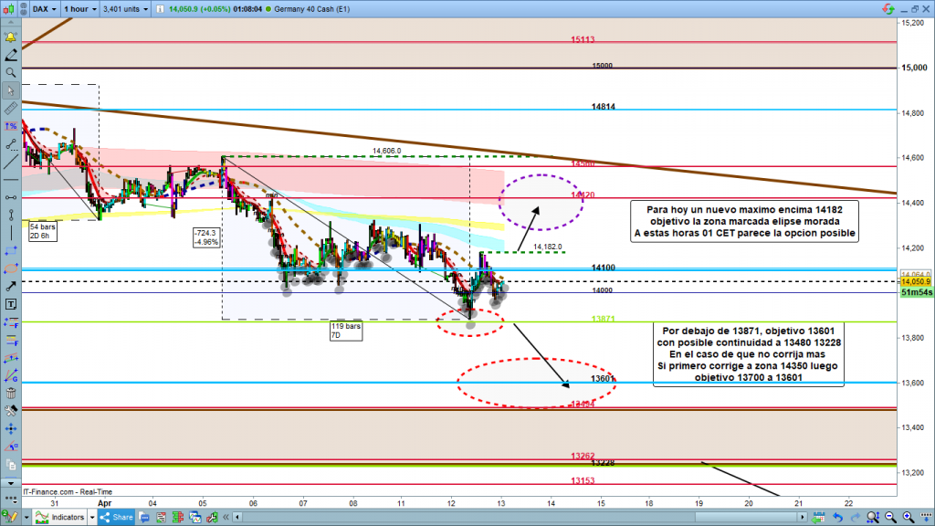 En cambio, si pierde los 13871, si los pierde directamente sin corregir más, el objetivo es 13601 a 13494, y si va con fuerza puede llegar hasta los 13262, 13228. Si, en cambio, es un día de volatilidad o fuerza mantenida y tuviéramos los dos recorridos, primero, corrección hasta 14420, y después nuevo impulso, este muy probablemente acabaría en la zona de los 13700 a 13601. Muchísima suerte y muy buenos trades.
