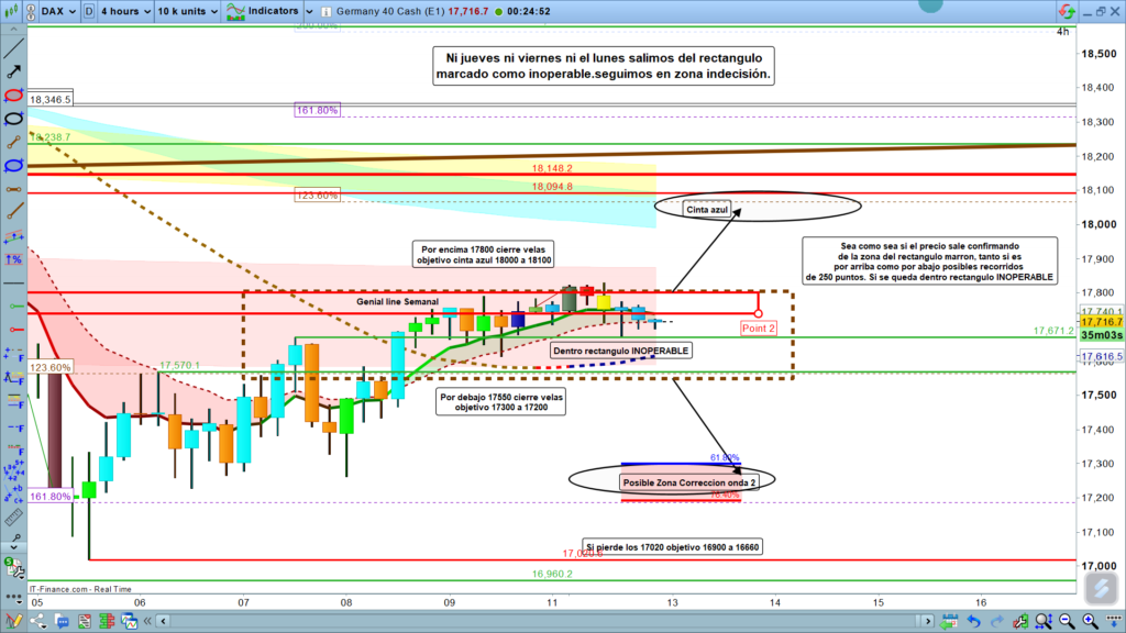 De nuevo, en gráfico de cuatro horas vemos como el posible planteamiento sigue siendo el mismo desde hace varios días. Tan solo con el quiebre de la parte superior en los, 17800, o con el quiebre por la parte inferior de los, 17550, permitirán algún tipo de recorrido significativo.