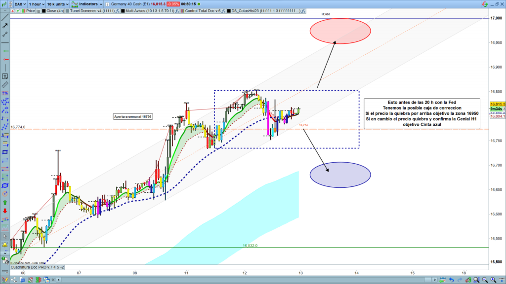 Por tanto, muy poco más se puede añadir al análisis del día de hoy, si no ha sido capaz de salir continuando la tendencia ni el lunes ni ayer martes con los datos de IPC, que fueron según consenso esperado, difícilmente va a ocurrir antes de la decisión de tipos de la Fed de esta tarde. Solo si consigue romper la zona dibujada como caja con linea discontinua, movimiento alcista hasta los 16950.