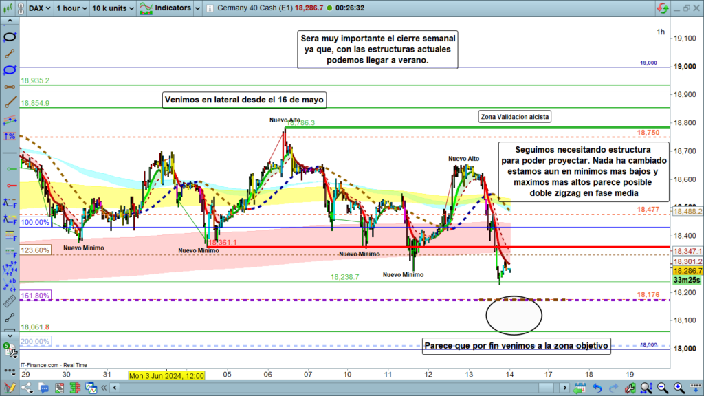 Para hoy, es muy probable que haya continuación del movimiento hasta la zona objetivo desde hace ya varias semanas en los, 18176 e incluso si persistiera la fuerza bajista, hasta la zona de los, 18000, zona del 200% de la proyección. De nuevo, el problema es saber si lo va a hacer directamente o antes volveremos a subir a la zona de los 18500, gran eje de todo el movimiento.