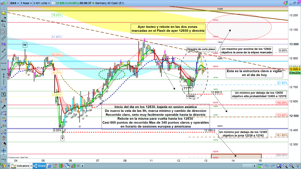 Si el precio gira de nuevo a alcista, sin antes tener un mínimo más bajo que el mínimo de ayer en 12653, y acaba quebrando la directriz de corto plazo. En el momento que tengamos un alto por encima de los 12942, trade de alta probabilidad hacia la zona marcada con la elipse. Las probabilidades en principio irán de más a menos a medida que el precio vaya subiendo. La cota 13037, prácticamente segura, si tenemos quiebre y confirmación de quiebre sobre los 13037, objetivo la cota histórica 13153, como objetivo principal. Si vemos que tenemos quiebre por encima de los 13153, no con plumas, sino con cierres de velas de H1. Entonces las siguientes zonas objetivo son los 13200, y pluma hasta la directriz mayor, la que viene desde principio de año, y quizás testeo y rebote en 13228.
