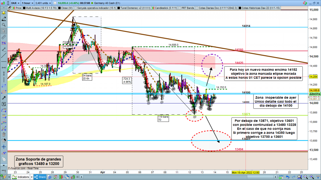 En gráfico de 1 hora del dax40, prácticamente el mismo planteamiento que ayer, los recorridos de ayer fueron tan pequeños, que no cambió nada. Seguimos en el mismo escenario. Solo cambia la zona de validación alcista que baja de los 14182 a los 14152, primera validación, con la confirmación más clara por encima de los 14182, mismo objetivo que ayer desde los 14300 a los 14420 dependiendo estructura dibujada. Por debajo solo un mínimo debajo de los 13871, objetivo, la zona 13700 a 13601.