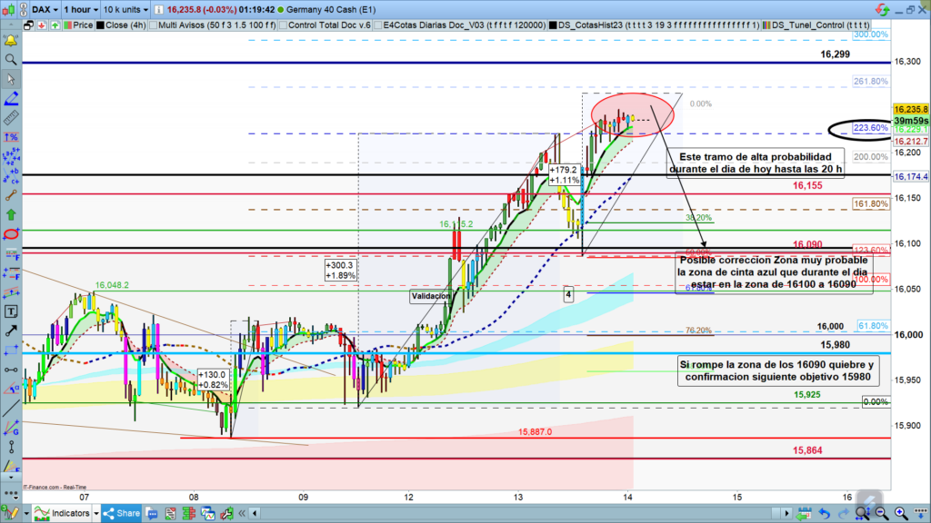 En el gráfico de una hora del Dax 40, podemos ver como después de los movimientos del día de ayer estamos en fase de completar este movimiento estructural. Concretamente, entre los, 16220, que era la zona objetivo, y con la volatilidad de los datos de ayer, esta zona se puede ampliar hasta los,16265, prácticamente a solo 15 puntos del máximo conseguido en el día de ayer.