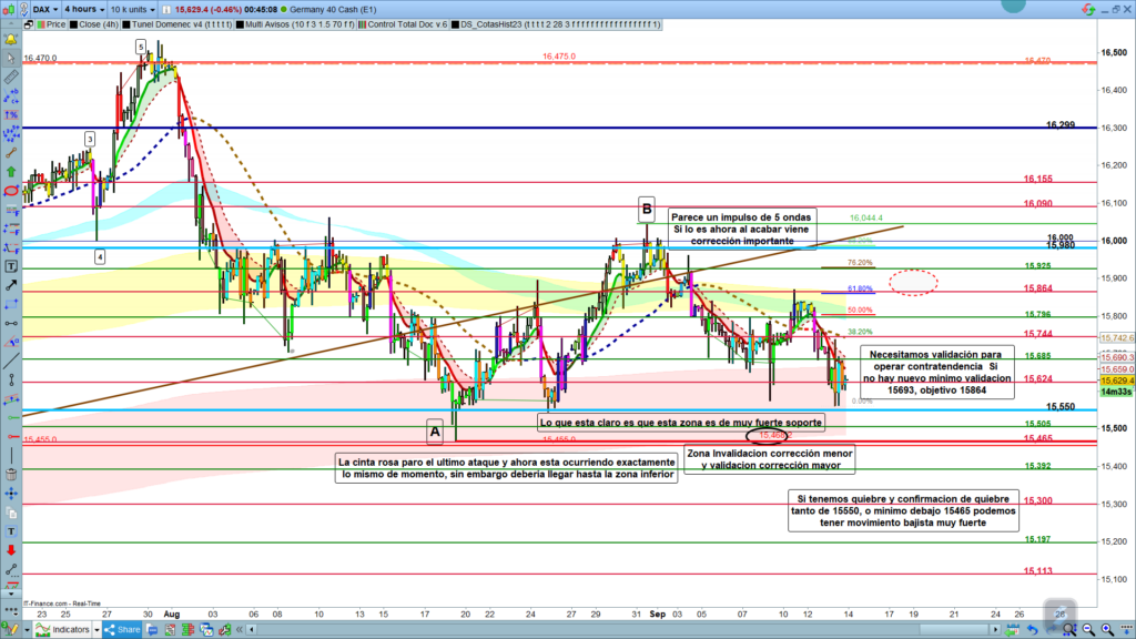 Si tenemos rebote alcista, con validación de entrada en gráficos menores, precisamente las dos zonas de posible objetivo coinciden con las cotas históricas diarias de la zona, los, 15744, y los 15864. Por tanto, en caso de validación alcista en gráfico menor, mucha atención a estas dos zonas objetivo, como siempre la primera de muy alta probabilidad, aunque con muchas zonas que van a actuar de fuerte resistencia, y solo el quiebre claro de esta primera zona, con su confirmación nos permitiría evolución hacia los 15864.