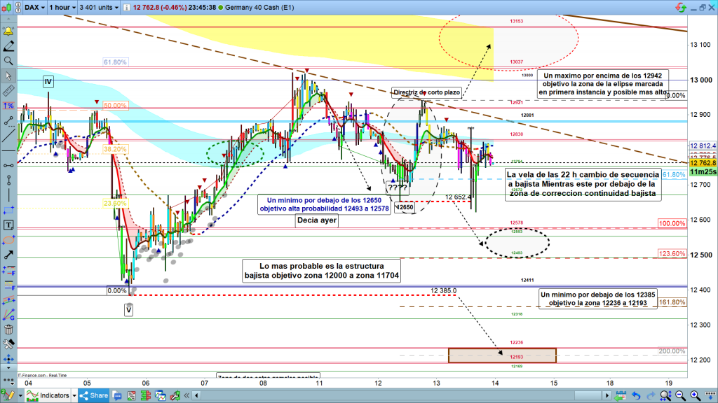 La zona que cambiaria el escenario y tendríamos nueva estructura que sin duda sería importante, es la zona del 12942. Mientras no la supere, Estructura bajista con objetivos, 12578, 12493, 12411, 12318 y 12236 a 12193, esta última con las dos cotas históricas gemelas, zona de parada con mucha posibilidad antes de acabar el movimiento en la zona de los 12000 a 11704 o incluso pluma inferior dentro de la zona 11704 a 11433. Muchísima suerte y muy buenos trades.