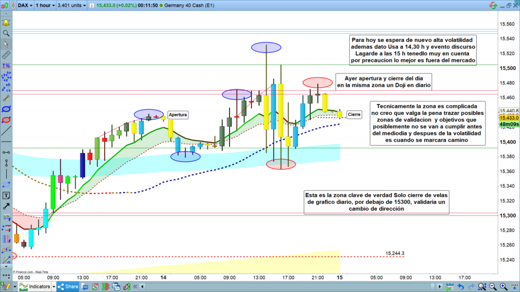 En gráfico diario muy poco a aportar, solo ver con más detalle, la zona entre la cinta azul y 15392, por abajo, y la cota histórica diaria de los 15465. Zona donde es probable que se mueva el precio hasta el episodio de volatilidad esperada al mediodía, cuidado con el discurso de Lagarde, por prudencia lo mejor en estas ocasiones es estar fuera del mercado en estos momentos. Después por la tarde, seguro que ya tendremos dinamización de los mercados y esperemos que ya marque camino. Muchísima suerte y muy buenos trades.