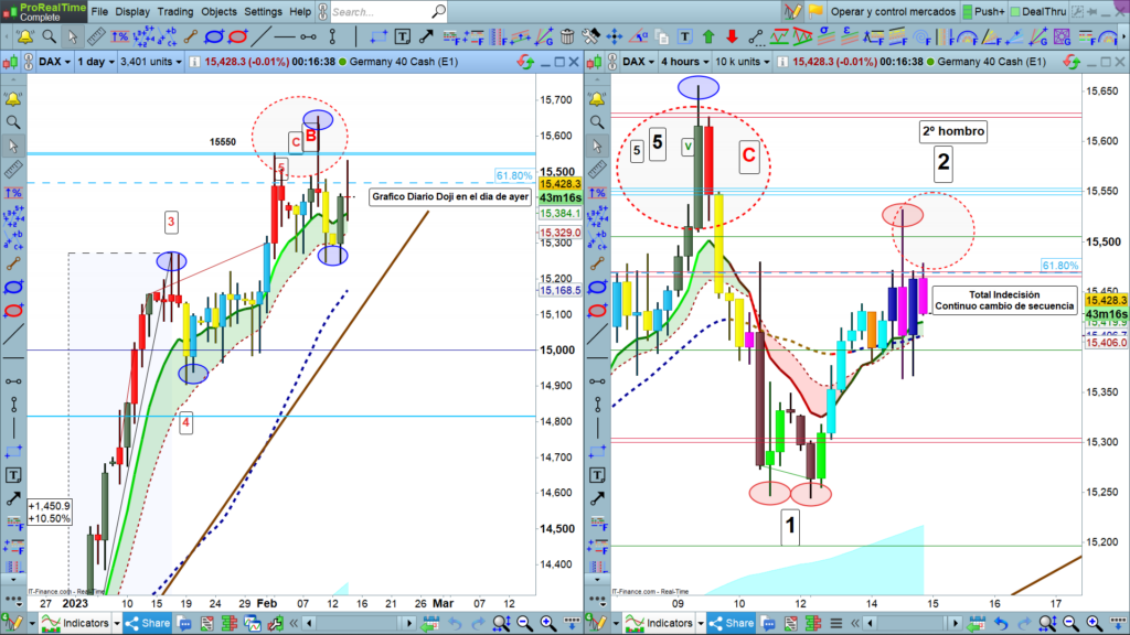 En gráfico diario, vemos perfectamente como la vela del día de ayer, pese a la amplia volatilidad, acabo en un doji de máxima indecisión o de cambio de dirección, lo que sí que ya confirma es, que pone fin al incipiente vela alcista que había dibujado anteayer, el pasado lunes. Lo único que hace el precio es reflejar de nuevo y por enésima vez estos dos últimos meses, la total indecisión que hay en el mercado, justo después de cada impulso, ni una corrección noble, en todos los casos, se para el precio en una pequeña zona. Ahora entre los 15392 y los 15465.