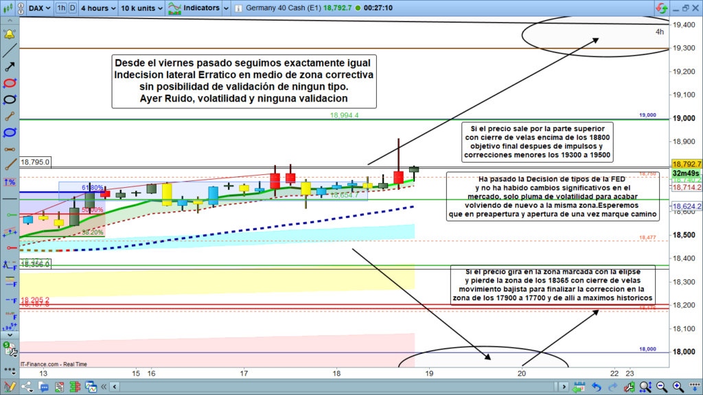 Ayer inicio del día en los 18700, y todo el día erráticos y en lateral para después de la Decisión de tipos de Usa, movimiento de alta volatilidad, vuelta a la zona de inicio sin ninguna validación y cierre del día en la zona de los 18770.