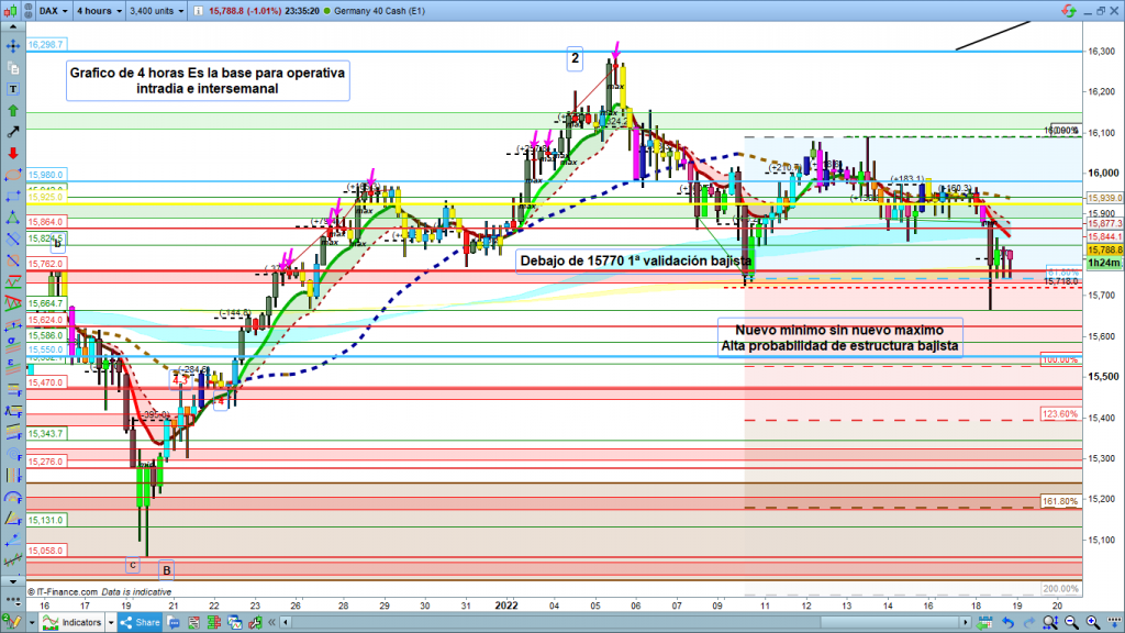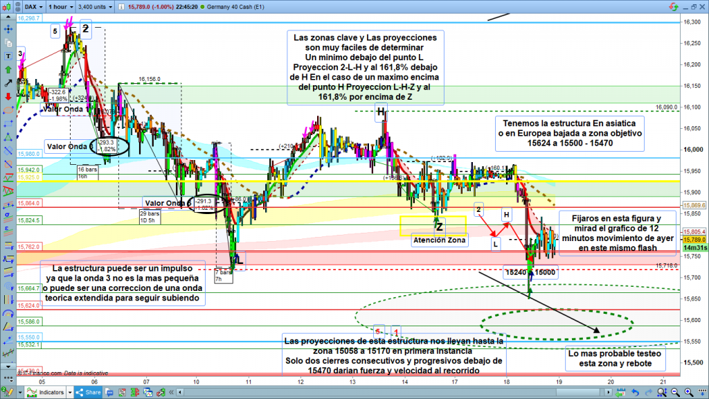 Para hoy, dependerá de lo ocurrido en sesión asiática. En principio por arriba, podría haber acabado ya la corrección en la zona de los 15840, o podría subir hasta la zona 15864 a 15890. La perdida de los 15664, valida la continuación del recorrido, objetivo amplio entre los 15624 a la zona ya tan conocida de 15550 a 15470. Lo normal seria que al llegar y testear esta zona, entráramos en nuevo rebote hacia la zona donde haya acabado el rebote de hoy en asiática o durante el día.