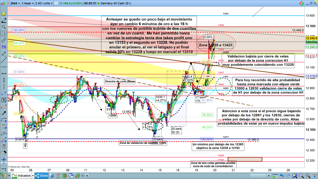 Resumiendo, validación bajista, con cierre de velas consecutivas y progresivas por debajo de la zona de corrección de gráfico de 1 hora, o con el mismo cierre de velas por debajo de la cota histórica de los 13228. Recorrido de muy alta probabilidad hasta la cota 12881, a partir de aquí, estudio con la estructura en curso, que ayudara a marcar los posibles objetivos. La zona de la directriz de corto plazo, más o menos en la zona 12760, podría ser la zona que separe las dos opciones, un cierre de dos velas de forma consecutiva y progresivas, con mucha prudencia, pero empezaría a validar más la opción de impulso bajista, que el de solo corrección para volver a subir. Muchísima suerte y muy buenos trades.