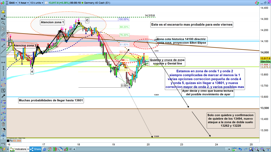 Para hoy, si no hay sorpresas, el movimiento debería ir hasta la zona marcada con la elipse superior, Hoy la he ajustado un poco hacia la derecha para que esté situada en la zona proyectable de hoy. La zona de la cota histórica del 14100, junto a la directriz, coincide además con la proyección de Elliot para el fin del movimiento y la zona de la cinta rosa, zona recuperada. Por tanto, la zona marcada, es la zona más probable para que llegue el precio y en esta zona rebote, ya en teórico impulso de primera onda 3 extendida. Vamos al menos según estructura, es lo que espero. No sé si este viernes o ya durante la semana que viene, pero si la estructura en curso es la correcta, que después de los movimientos de los dos últimos días aún ha confirmado con más claridad, estamos ya en situación de empezar las ondas 3 extendidas con caídas importantes.