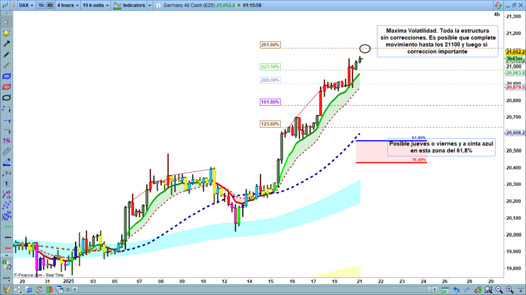 - Evolución actual: El mercado ha registrado solo pequeñas zonas de consolidación lateral, sin signos claros de corrección. Este patrón refuerza la expectativa de alcanzar el objetivo inmediato en torno a los 21,100 puntos, una zona clave que podría actuar como resistencia.