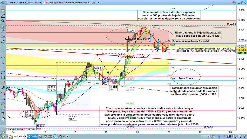 Resumiendo, mientras el precio este por debajo de la zona de corrección de gráfico de 1 hora, lo normal es ir siguiendo el recorrido, un mínimo por debajo de los 13125, nos llevaría muy probablemente hasta los 13090, y si hay fuerza, incluso llegar ya directamente hasta los 13000 a 12881. Si el precio sin hacer nuevo mínimo por debajo de los 13125, subiera y tuviéramos un alto por encima de los 13311, objetivo sub onda 2 zona 13360 a 13380. Y desde esta zona girar, de nuevo validación con zona de corrección de H1, y recorrido bajista importante con cientos de puntos por delante.