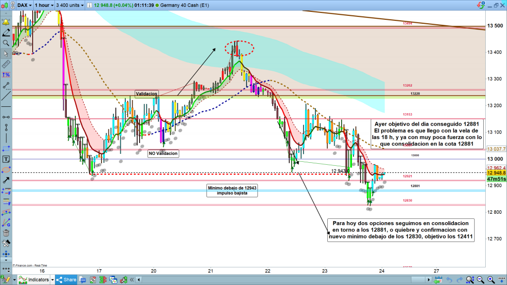 Ayer movimiento hasta objetivo esperado, aunque no fue nada fácil ni noble, con bajada directa, sino que a las 9 h bajo a validar el objetivo 12881, con un mínimo por debajo de los 12943. Luego la vela de las 13 h, marco un máximo en corrección en 13110, corrección de 160 puntos, antes de bajar hasta objetivo. El testeo del objetivo 12881, no se produjo hasta la vela de las 18 h, ya con muy poca fuerza, el resultado consolidación en torno a los 12881 con rango amplio. Por abajo alcanzo la zona de influencia de los 12830, cota histórica diaria, el precio llego hasta los 12837, y de nuevo a zona de corrección de H1, en la zona de los 12980, de nuevo corrección de más de 150 puntos ya en la finalización de la sesión americana.