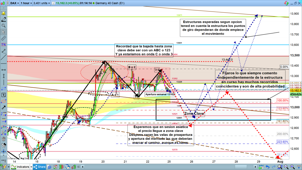 Estos dos párrafos, escritos justo antes de la apertura semanal, son para recordar lo más importante del análisis general y que sirva además como recordatorio. Llegado el precio hasta la zona clave, esperemos que llegue, en esta zona cualquier detalle será importante. A partir de la zona clave, tenemos dos posibles estructuras de continuación. Análisis general del dax 24 julio 2022. En el análisis del fin de semana todo muy detallado, lectura casi obligatoria. Aquí solo resumen recordatorio. Posible estructura de corrección de doble cuerpo hasta zona objetivo 13871 a 14000. Posible continuación de impulso bajista, después de corrección hasta 13447, como onda 4-3, y objetivos, zona 12042 a 11704, con estructura de bajada dibujada en gráfico de 4 horas del Análisis general.
