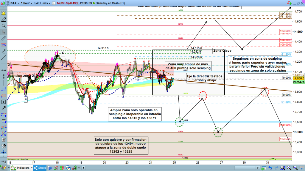 Para hoy, seguimos en zona de consolidación, amplia de 400 puntos, mientras no tengamos claras validaciones, por arriba con un alto por encima de los 14315, o por abajo, parece lo más probable, al menos según mis conteos y mi experiencia, por debajo de los 13871, el movimiento esperado para hoy puede ser muy parecido al de ayer. Errático deambulando en la zona de consolidación apoyos sobre la directriz, ataque a los 14100, si hay apoyos sobre los 14100, podría llegar hasta los 14200. O si hay rebote de nuevo en los 14100, de nuevo a zona de directriz y buscando el mínimo de ayer. Muy complicada la operativa. Si sois un poco expertos ya sabréis que los únicos momentos aprovechables serán las aperturas de los mercados europeo y americano.