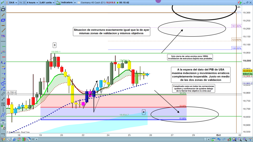 Con la estructura intacta y los puntos clave sin cambios desde ayer, hoy será un día de espera para obtener una validación clara en cualquiera de las dos direcciones. Se recomienda evitar operar en la zona de indecisión entre los 18.860 y los 19.000 puntos hasta que haya una ruptura definitiva. Mañana, con la publicación del dato del PIB de EE. UU., podríamos ver una mayor definición en el mercado.