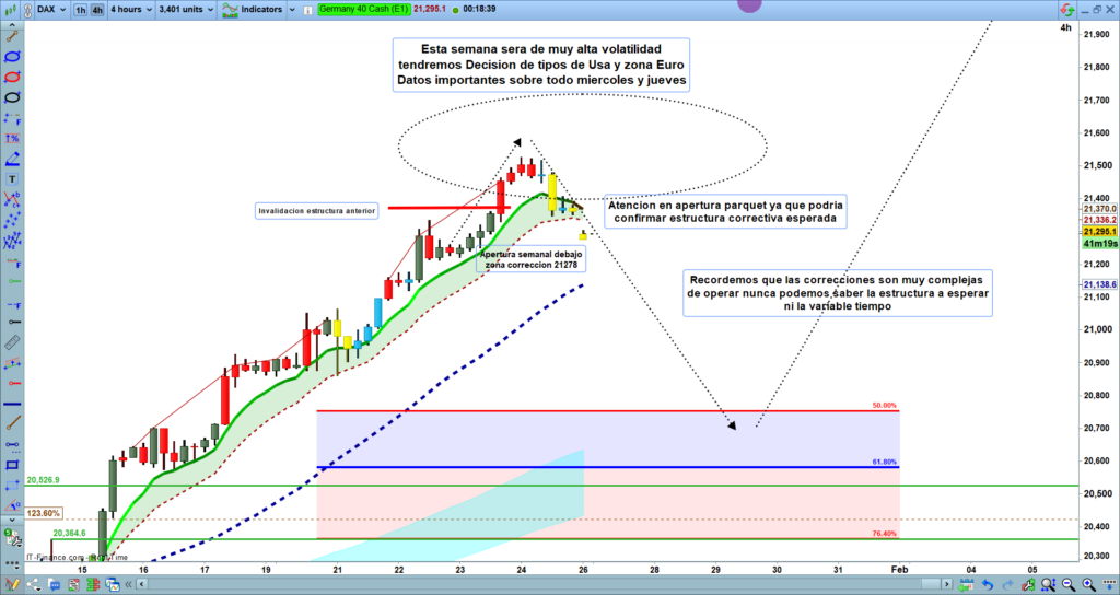 Análisis diario Dax, tipo flash corto, lectura de 2 a 4 minutos, con las claves del día. Ondas de Elliot, estructuras de precio, zonas clave y objetivos.