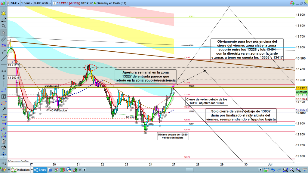 A estas horas la zona de corrección se encuentra entre los, 13170 y los 13125, con la cota histórica de diario en 13153, primer objetivo para este inicio de semana. Si el precio pierde los, 13153, mucha atención a la zona de los 13110, cierre de velas de H1 por debajo, siguiente objetivo la cota histórica 13037. Cota donde el pasado viernes se validó el movimiento alcista hasta la zona de los 13228.