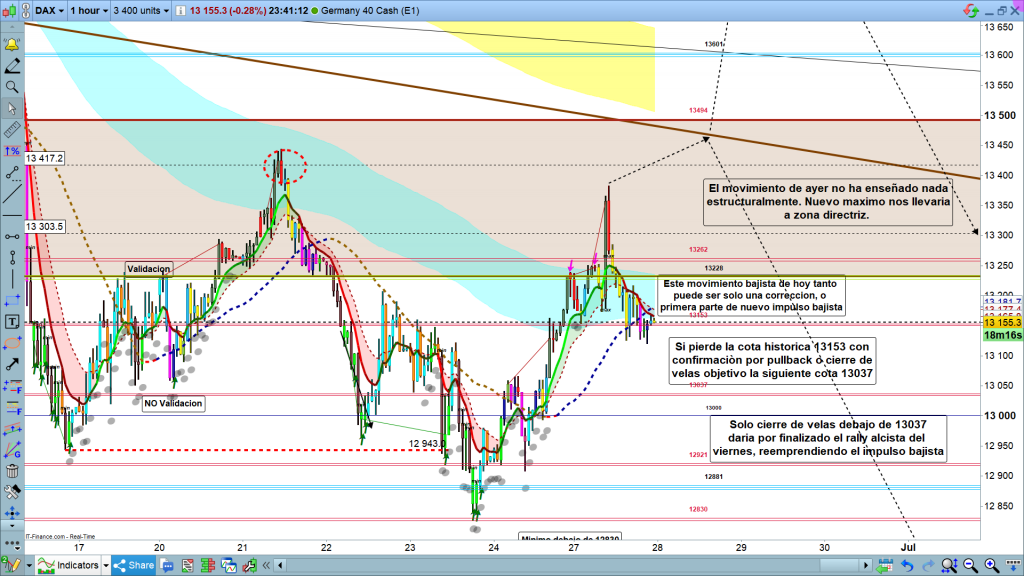 En el caso de ser inicio de impulso, debería seguir por debajo de la zona de corrección y de la Genial line de H1, y bajar de entrada hasta la cota de los 13037. Ahí, en esta zona sería la zona clave para determinar si la corrección ha finalizado y estamos en nuevo impulso bajista importante o, por el contrario, aún quedan recorridos de nuevo por encima de 13037, con varias posibilidades, que ahora no vale la pena enumerar. En el caso de que se dé este último supuesto, mañana ya dibujaríamos con más precisión los diferentes posibles.