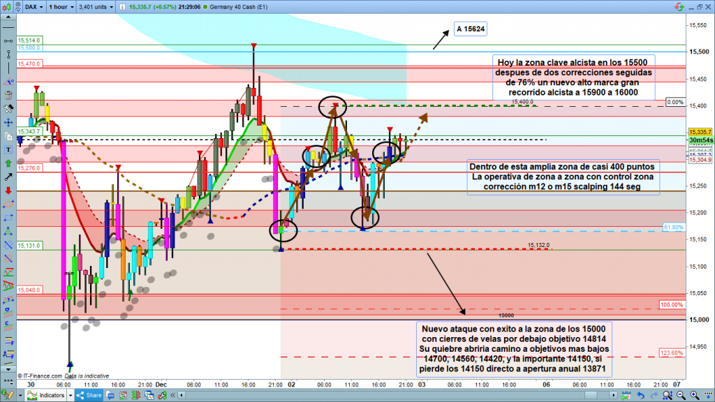 Solo a nivel anecdótico, hoy he empezado a realizar este estudio más temprano de lo habitual, y si os fijáis en el gráfico del inicio, cuando he hecho la captura estaba en curso la vela de las 21 h. Tenía una vela de las 18 h azul como cambio a ciclo alcista. Las velas de las 19 h, 20 h, y 21 h, habían realizado secuencia de ligeros máximos más altos. Como estaba marcando con flechas la operativa de cota a cota o zona SoR a zona SoR, del día de ayer, he marcado como movimiento futuro previsible el camino hasta la zona superior. Y he entrado con trade alcista en la zona de corrección de H1, en 15319. Más tarde, mientras esperaba el cierre de la vela de las 23 h, he visto que estaba a menos de 3 puntos de mi take profit en 15380. Pero no ha llegado a cerrarlo, al ver que salía línea de divergencia de mi indicador de multi avisos, he cerrado el trade en 15365 al cierre de la vela de las 23 h o sea a las 00 h. Estos son los detalles a buscar para aprovechar al máximo la operativa de cota a cota. Muchísima suerte, muy buenos trades y muy buen fin de semana y recordar mucho cuidado a las 14,30 h, posible volatilidad por publicación de datos empleo Usa y sus posibles diferencias con el consenso ya descontado. Hoy es primer viernes de mes, del último mes del año, normalmente la mínima diferencia con el consenso puede provocar alta volatilidad.