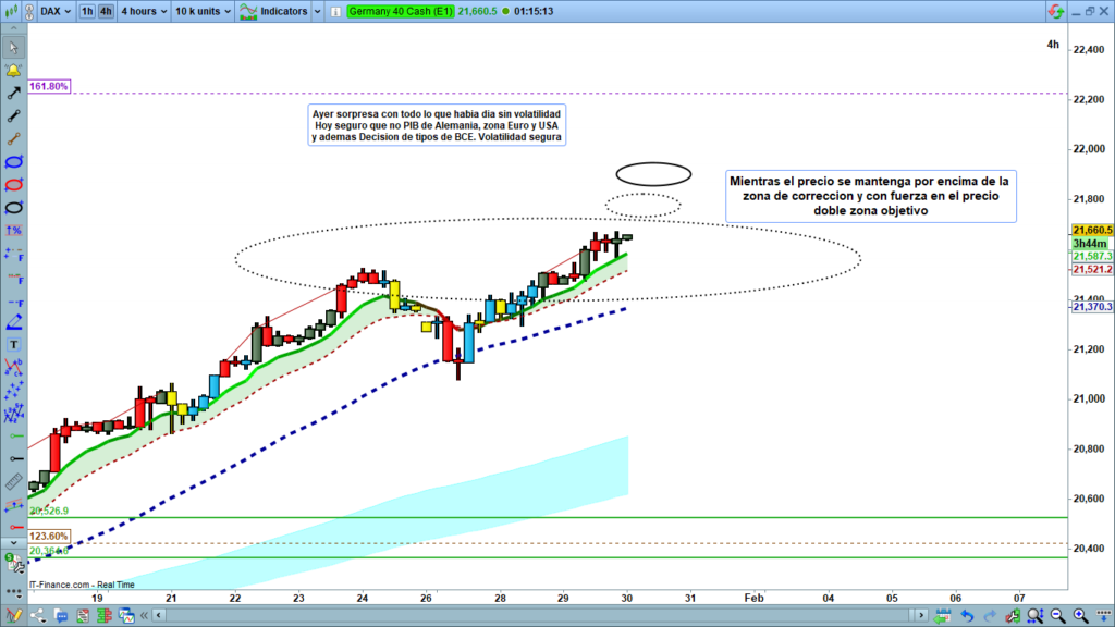 Ayer, según lo esperado, recordemos ya habíamos validado el movimiento alcista con la vela de las 5 h, precio siguió el impulso alcista con fuerza alcanzando la zona de los, 21676, apenas a 0 puntos de la zona esperada y marcada para el día de hoy. La sorpresa es que no hubo volatilidad con todo lo que está ocurriendo en el ámbito de los mercados financieros, y tos tan importantes como los que tuvimos ayer desde USA.