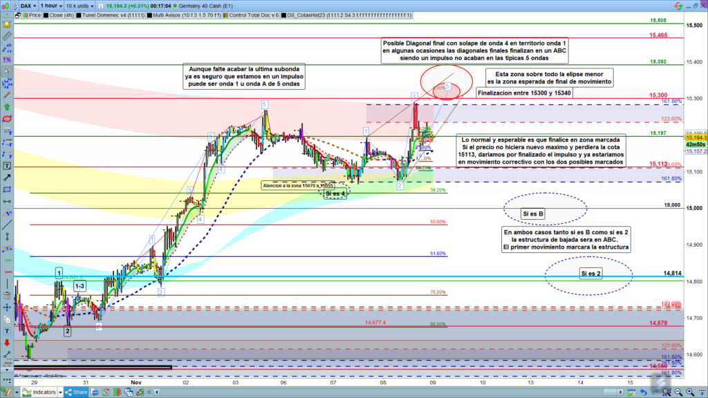 En el corto plazo, el movimiento más probable es subida hasta la zona entre la cota histórica de los, 15300, y de los, 15340, sin embargo, el dibujo nos marca una posible estructura de Diagonal final. En algunas ocasiones todo y ser un impulso, si el final de movimiento es con una diagonal final, la estructura que puede dibujar es tan solo de tres movimientos. Por lo tanto, deberemos buscar en gráficos menores validaciones estructurales que nos proyecten hasta la zona esperada. Solo, pérdida de la cota histórica de los 15113, sin hacer un nuevo alto, validaría ya el final de la estructura y estar inmersos ya en el movimiento correctivo bajista que siga a la evolución del actual movimiento.
